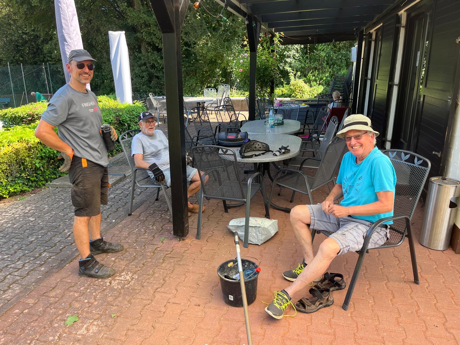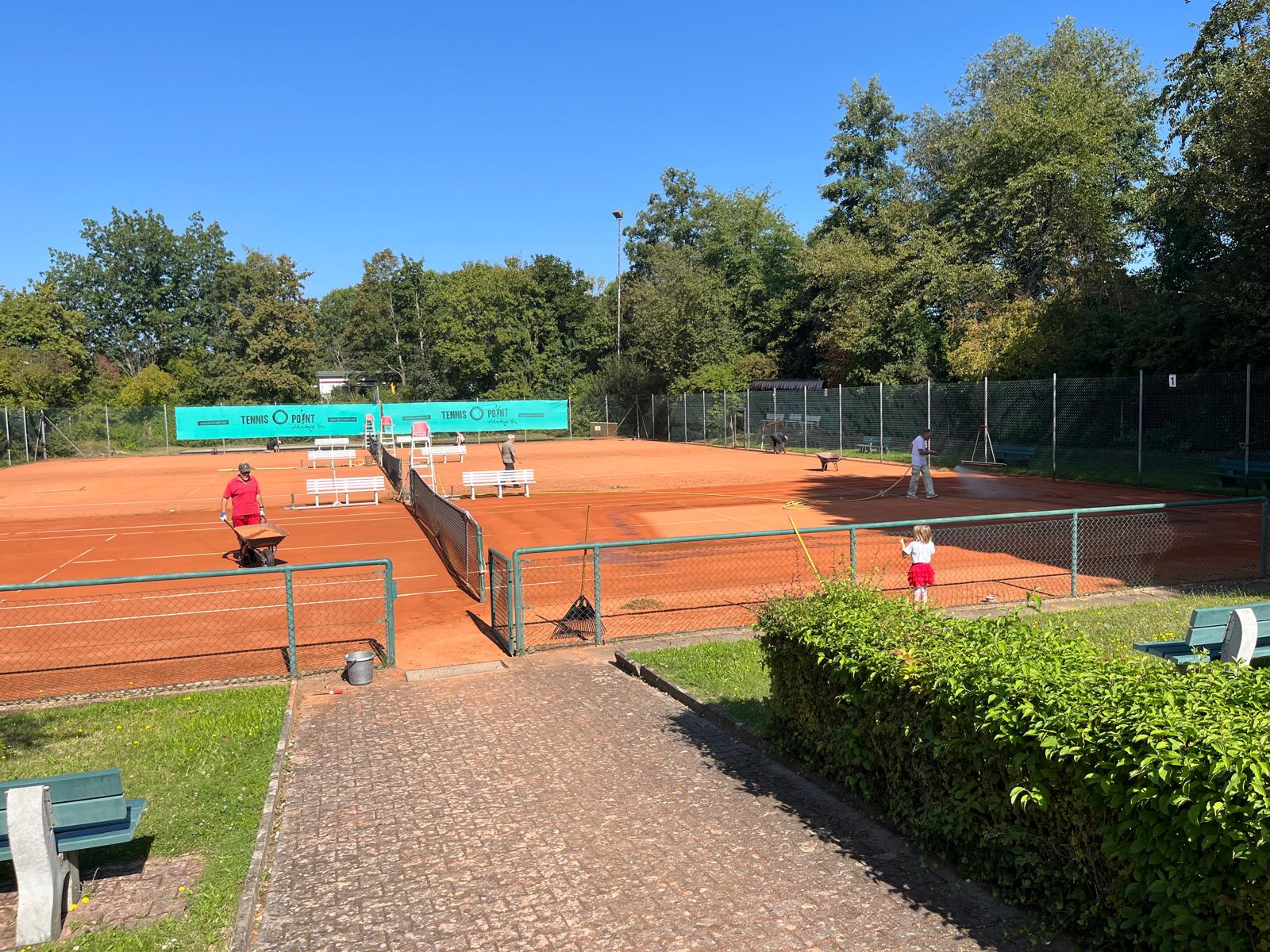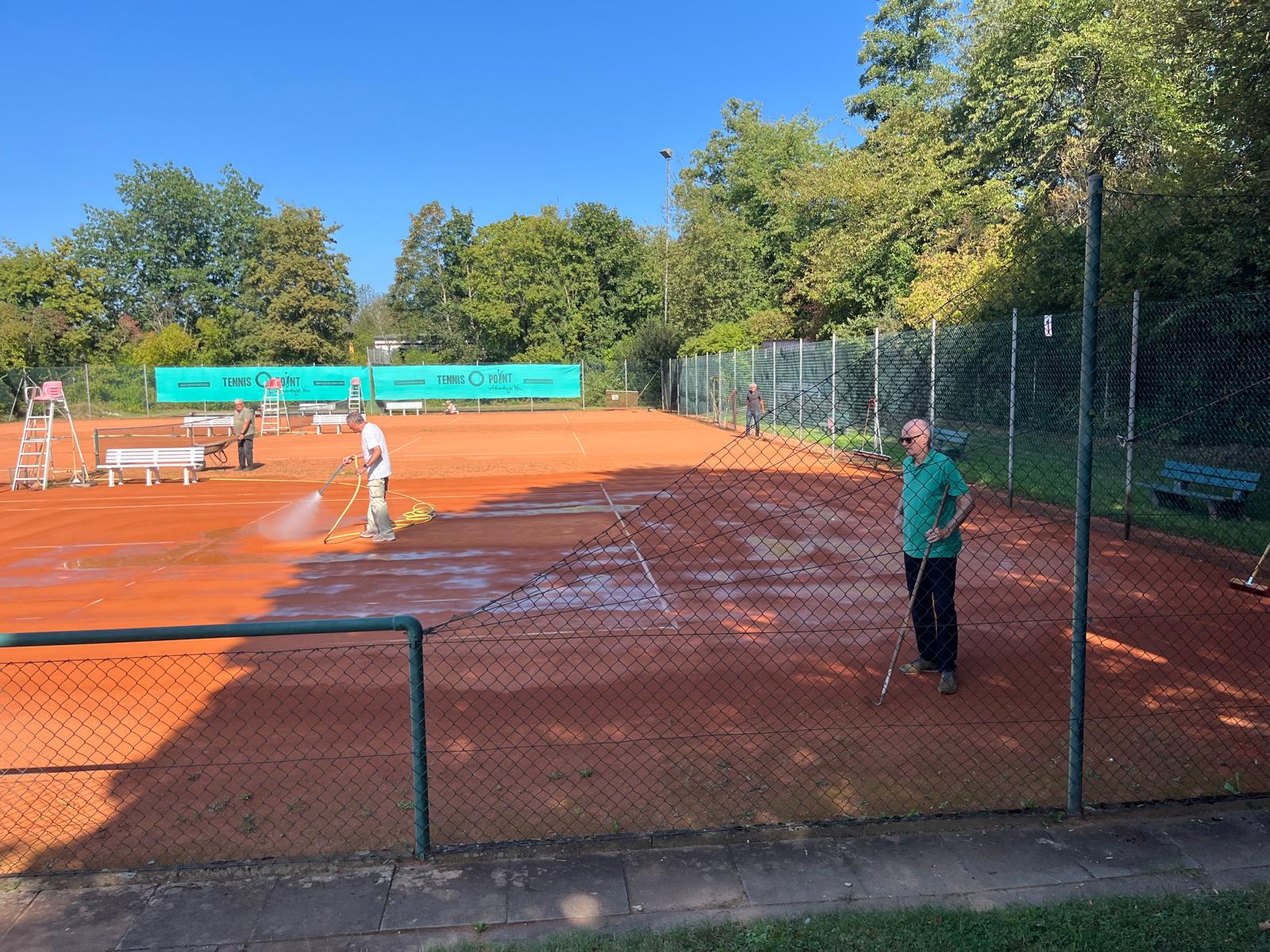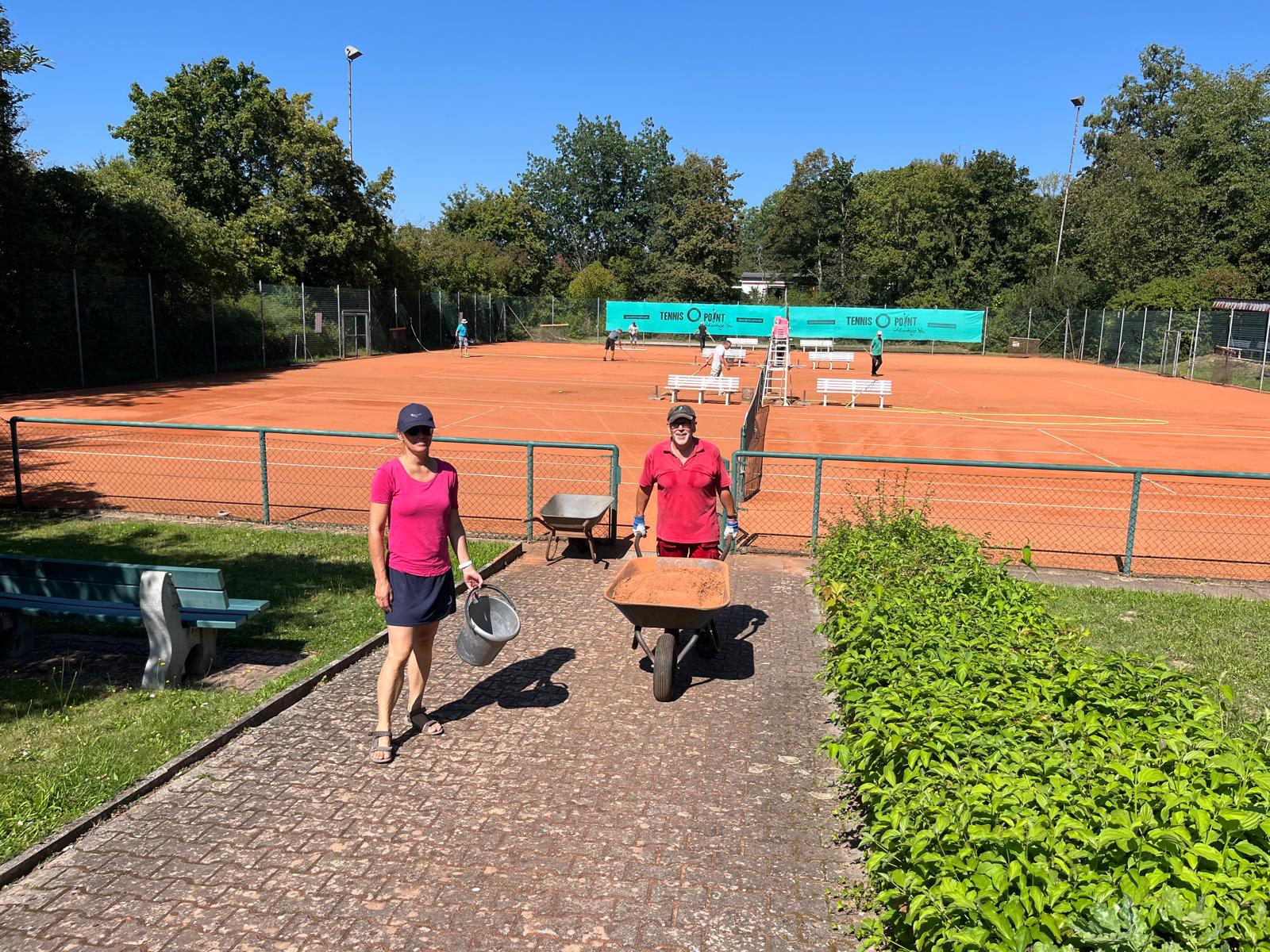 Trotz großer Hitze hatten sich 11 unermüdliche Helfer (darunter zwei Frauen) zum Arbeitseinsatz eingefunden. Nach 3 Stunden waren alle Arbeiten erledigt (von 3 Plätzen Unkraut entfernt und überschüssiges Ziegelmehl abgetragen). Die Plätze sehen wieder so gut aus wie nach der Frühjahrsrenovierung. Vielen, vielen Dank dafür.