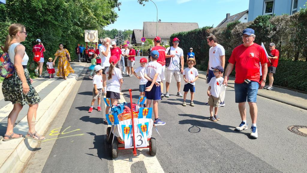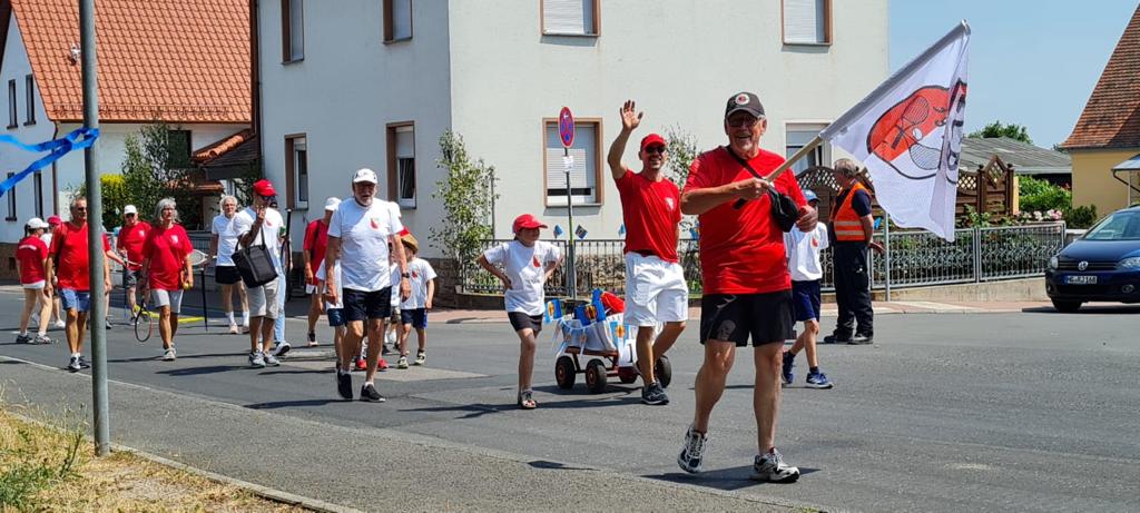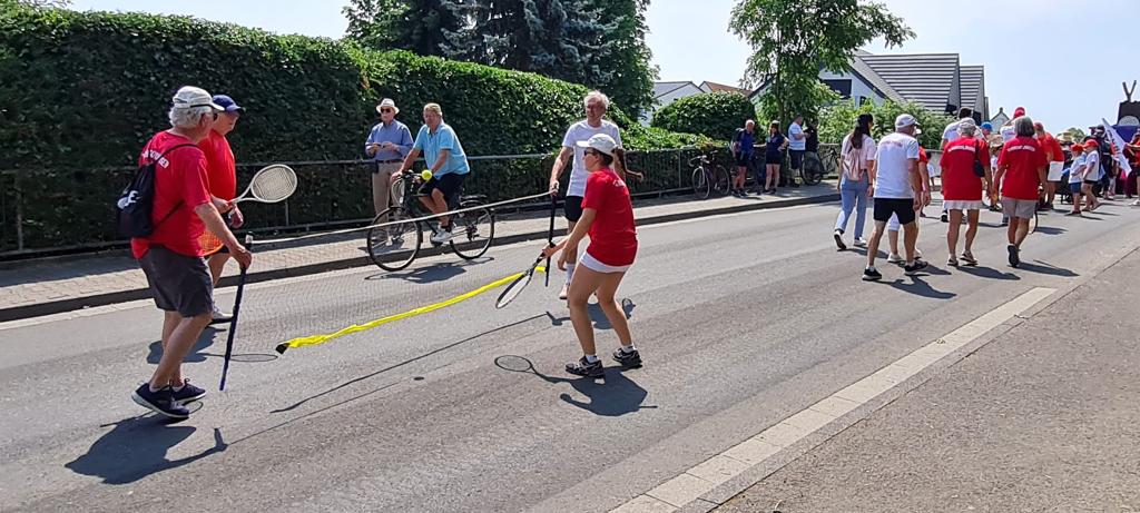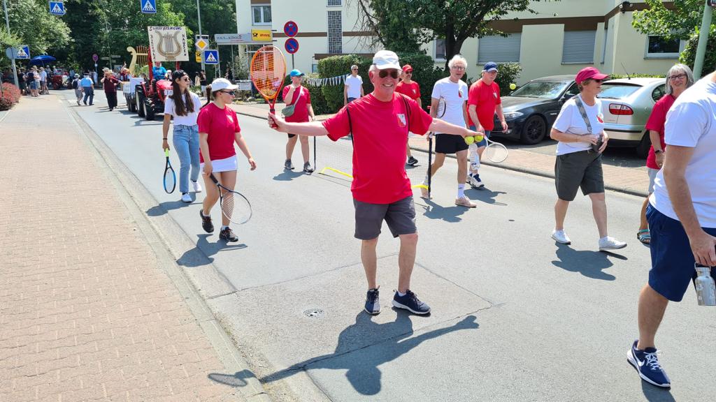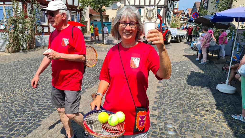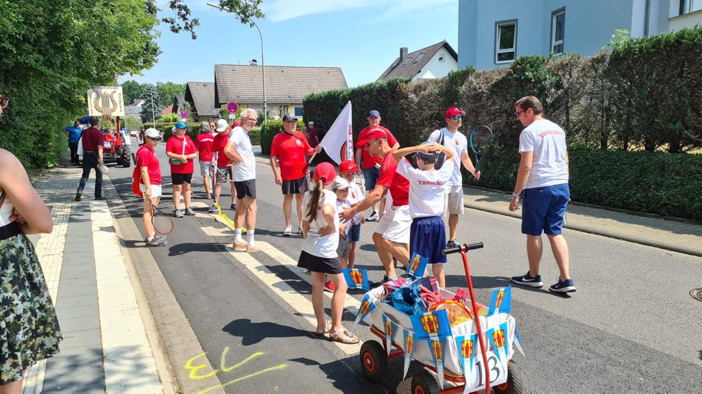 800 Jahre Burgholzhausen. Natürlich war auch der Tennisclub dabei. Nicht nur mit tatkräftiger Hilfe beim Aufbau des Festzeltes, sondern auch beim Jubel für die Stars im Festzelt. Und beim Festumzug am Sonntag, dem Höhepunkt bei strahlendem Sommerwetter, sowieso. Fast 30 Mitglieder des Clubs fanden sich am Sonntagvormittag ein. Eingekleidet mit den Shirts zum Jubiläum zogen Jung und Alt des Tennisclubs durch die Straßen von Burgholzhausen. Vorne der Fahnenträger, dann der Bollerwagen mit Getränken und in der Mitte ein Tennisnetz, über dass von allen Mitwirkenden fast 2 Stunden unentwegt Bälle über das Netz geschlagen wurden.